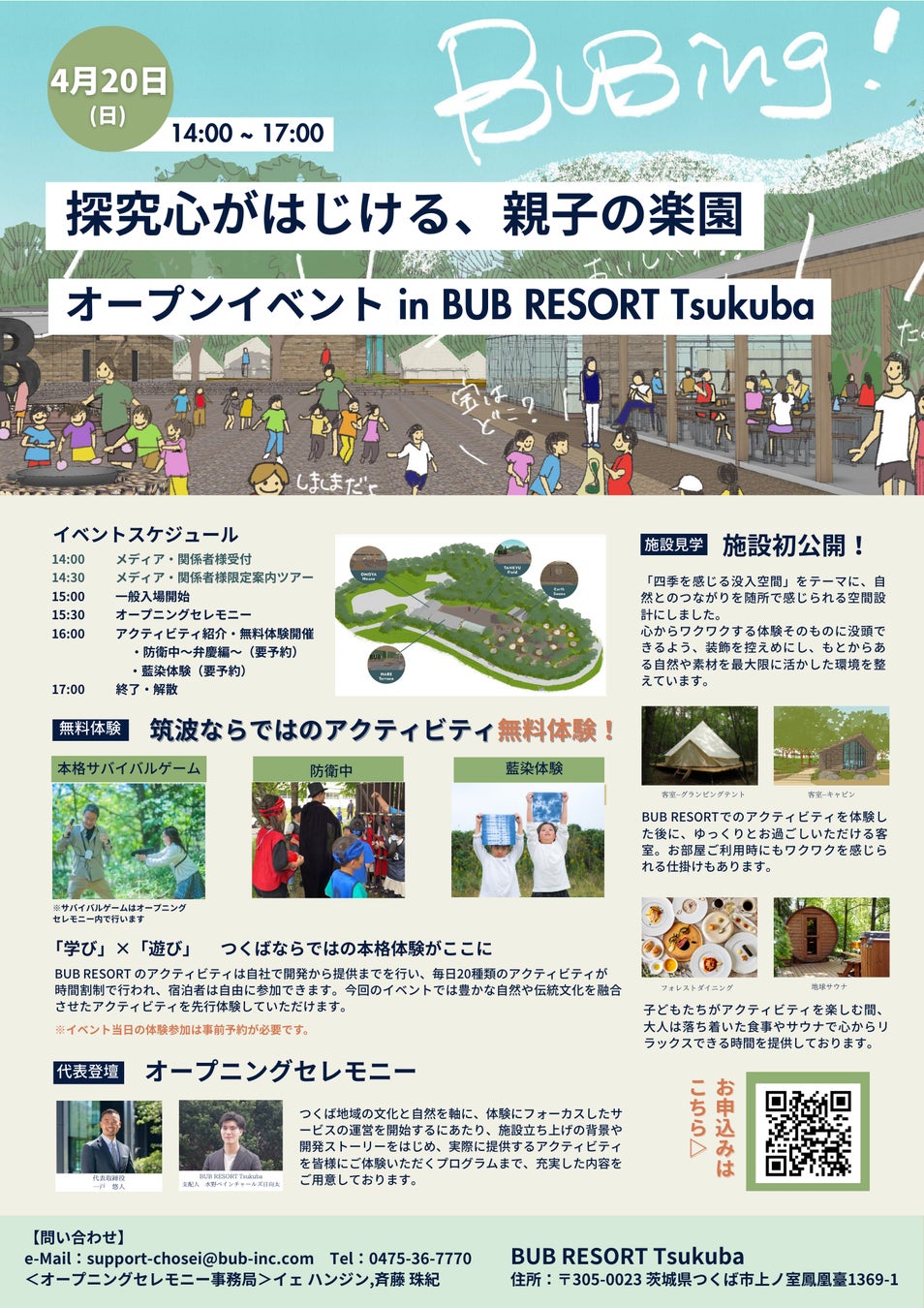 4月20日のオープンイベントでは、自然を五感で楽しめる&親子それぞれの体験に没頭できる空間設計について、メディアの皆様向けに施設見学ツアーを実施致します。取材に役立つプレスキットの配布や個別インタビューの機会もご用意し、当日の取材撮影も可能です。実際の体験の様子を取材いただきながら、BUB RESORT Tsukubaの魅力を存分にご体感ください。