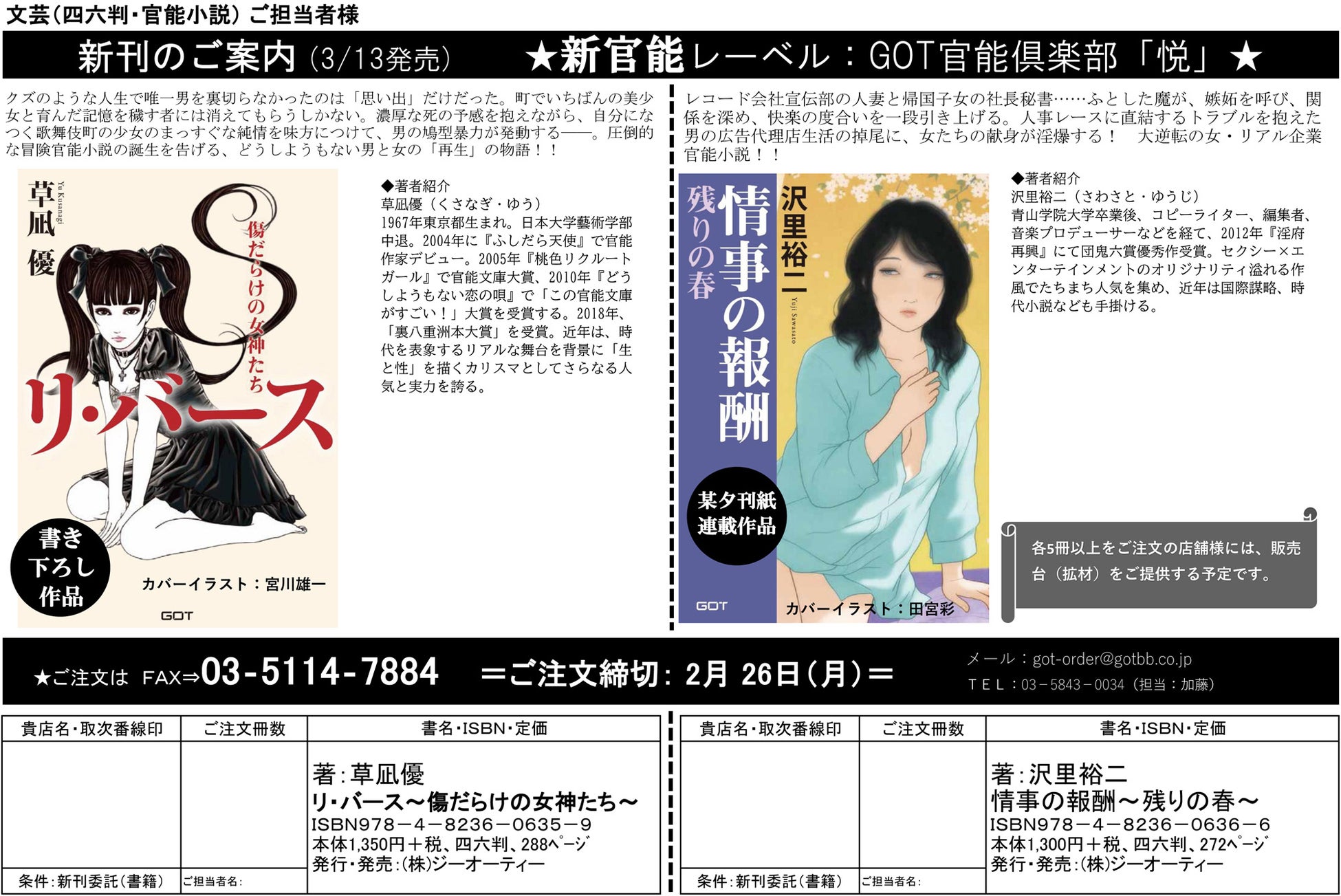 株式会社ジーオーティー(本社:東京都港区、代表取締役:吉永敦仁)は、新たな書籍レーベル『GOT官能倶楽部「悦」』を立ち上げ、書店様からの事前注文を開始いたします。