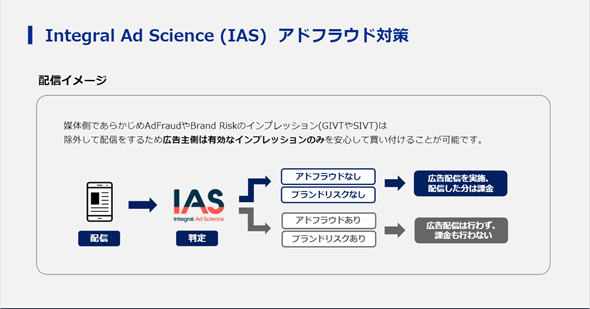 IASの連携により、Web Publisher側であらかじめAdFraudやBrand Riskのインプレッションは除外して配信をするため、広告主側は有効なインプレッションのみを安心して買い付けることが可能です。