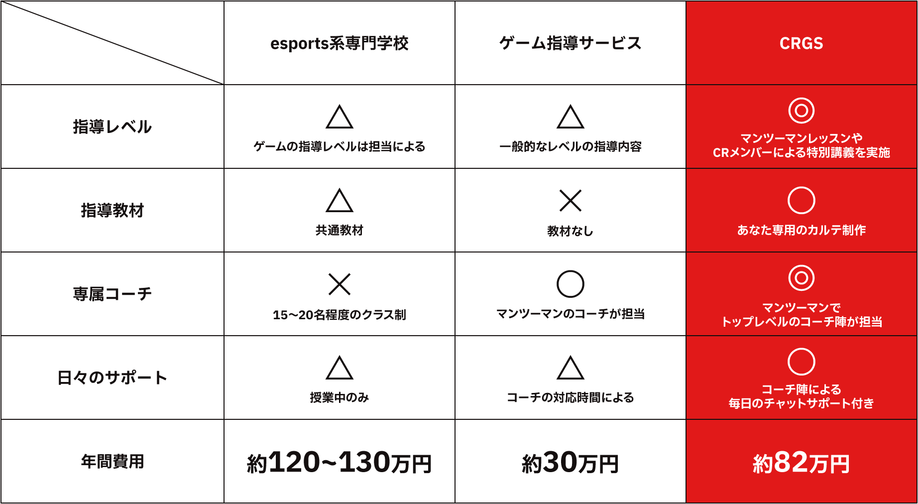 受講生一人ひとりに厳選されたコーチが付き、週に一度のマンツーマンレッスンで独自のカルテを利用した新たな指導や練習時間のスケジューリングを行ったり、毎日いつでも質問できるチャットサポートがあったりと、『APEX Legends』などの人気タイトルの指導を受けることができます。(※対応タイトルは随時追加予定です。)また、基準を満たした希望者にはプロチームの合同トライアウトやCRGS公認コーチ採用試験の案内、esports業界を知りたい方に向けたesports企業の説明会を実施するなど、受講生のesportsにおける可能性を広げるサポートをする仕組みを提供予定です。
