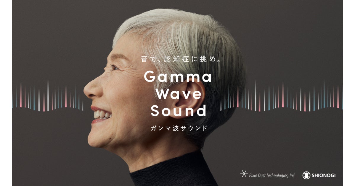 「ガンマ波サウンド」は、PxDTと塩野義製薬株式会社(本社:大阪市中央区、代表取締役会長兼社長CEO:手代木 功、以下「塩野義製薬」)の2社が開発した、テレビやラジオなど、日常のあらゆる音をリアルタイムに変調することで、生活をしながら認知機能をケアできる可能性がある音です。40Hzの周波数は、ヒトが記憶や推論などの問題解決型の思考をしているときに現れる脳波「ガンマ波」と同じ帯域であり、認知機能障害の特徴の一つとして、脳内で認知機能を発揮するのに必要な脳の特定のリズム活動(ガンマ波)が低下していることなどが報告されています※1。また、40Hz周期の音の呈示によって、マウスの認知機能が改善した研究結果や、ヒトを対象とした臨床試験においても40 Hz周期の音と光を用いて認知機能悪化の抑制や脳萎縮の抑制を示唆する研究結果が得られており、40Hz音は世界的に注目を集めています※2。