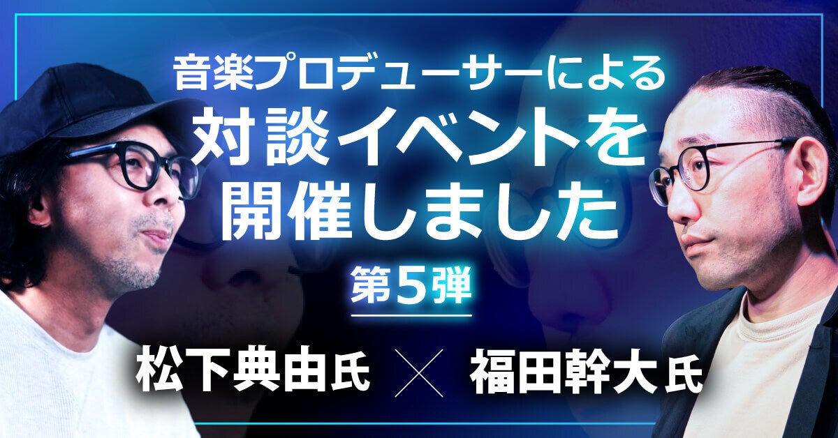 今回は、第5弾となる音楽プロデューサー対談イベント。松下典由氏と福田幹大氏をお迎えし、音楽を軸にさまざまな話題を取り上げました。松下典由氏は、作曲、編曲、マニピュレーター、ギタリストとして有名アーティストの作品に多数参加。男女ソロアーティスト、声優、アイドル、ロックバンド等、幅広いジャンルで活躍されています。福田幹大氏は、音楽プロデューサー、音楽ディレクターとして活動。福田うまる名義で作詞、作曲、編曲を手掛け、高い評価を受けています。そんな二人による今回のイベント。音楽を軸に、原体験や楽曲制作、活動についてなど、さまざまな話題を取り上げました。