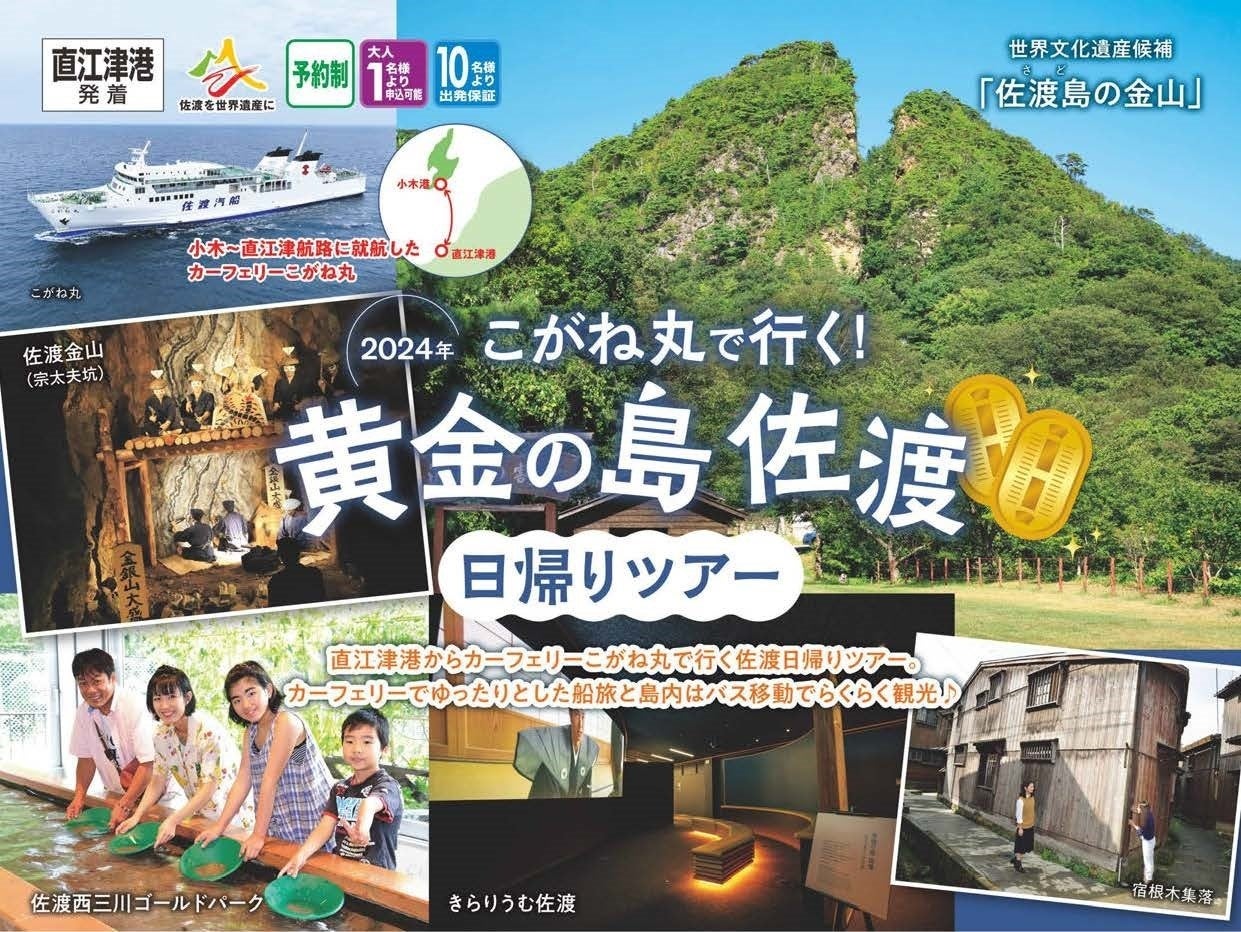 佐渡汽船株式会社は、小木~直江津航路にカーフェリーが運航再開する本年3月29日に合わせ、直江津港発着の日帰りツアー「こがね丸で行く!黄金の島 佐渡日帰りツアー」を設定、販売開始いたしました。