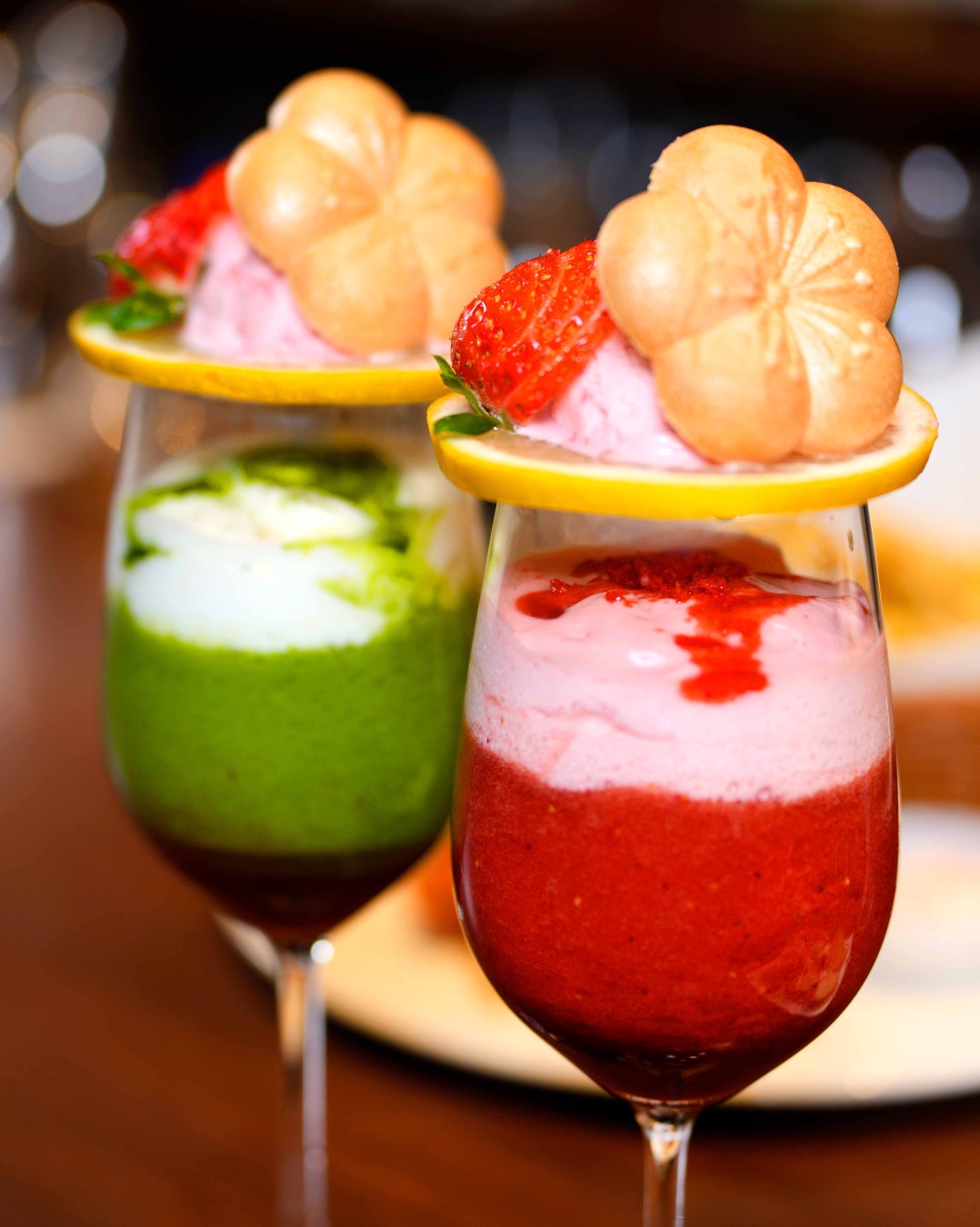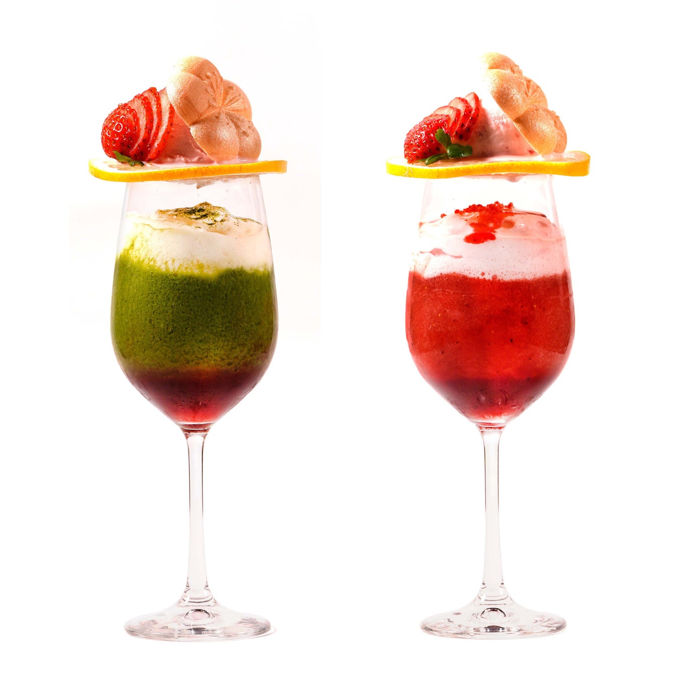 グラスの上はスライスしたグレープフルーツで蓋をし、苺のアイスとフレッシュな苺と梅最中を添えました。濃い抹茶の味わいと梅と苺の酸味が絶妙にマッチしたカクテルです。