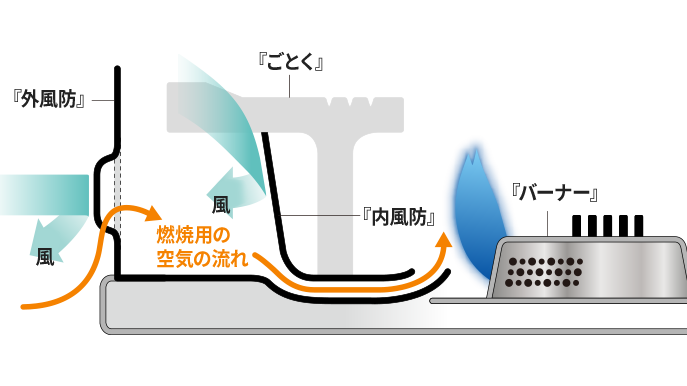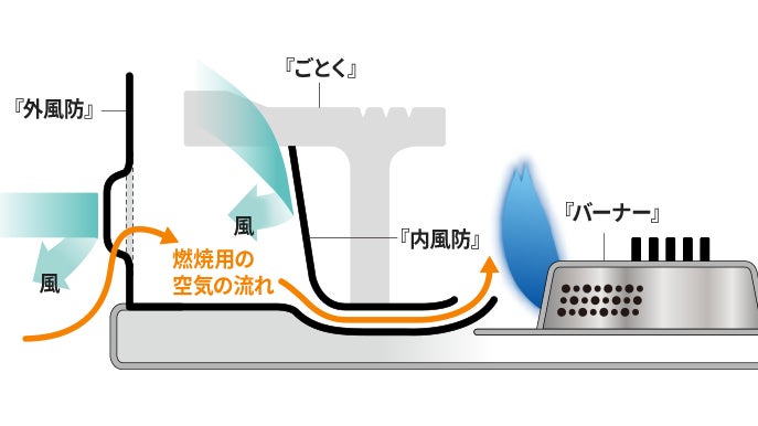 本体・容器カバー:鋼板 ごとく・風防ユニット:ホーロー用鋼板 バーナー:ステンレス鋼板 つまみ:ABS樹脂 脚:アルミダイキャスト |