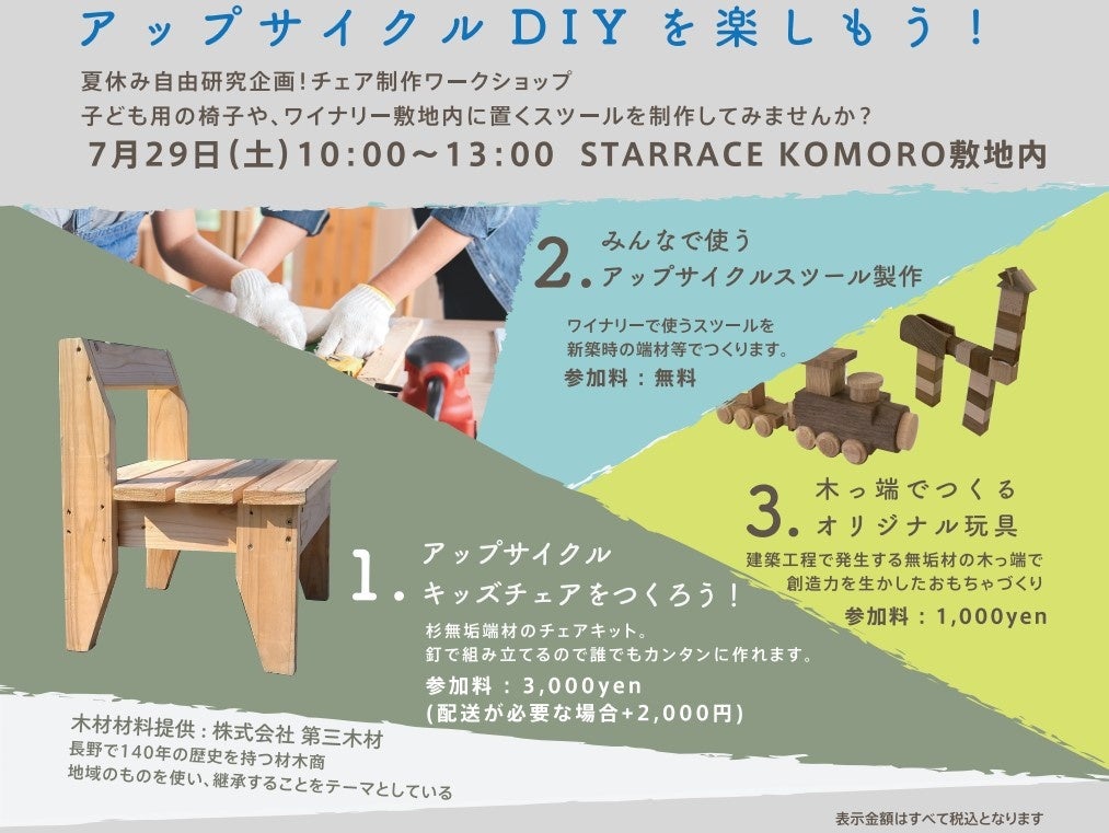 2023年3月20日に竣工した「STARRACE KOMORO」は、長野県小諸市で農業やワイン造りを事業運営する株式会社Greve.tを事業主としたワイナリー・ショップ棟とレストラン棟を兼ね備えた複合施設で、都市公園の利用を促す「公募設置管理制度(Park-PFI)」を長野県で初めて活用した施設です。オープンから今日まで、地元や周辺地域の方々に愛され、日常に溶け込んだ施設として多くの方にご利用いただいております。今回、リノベるでは「STARRACE KOMORO」が地域の皆様にさらに愛される施設となるよう、リノベーションにも通ずるアップサイクルをテーマにしたワークショップを実施いたします。キッズチェアや、無限大の組み合わせを楽しめるオリジナルおもちゃ、そして、製作後はワイナリーに設置される椅子など、モノづくりの楽しさと愛着を体験いただけます。また、ワークショップで使用する木材は、開催場所である「STARRACE KOMORO」建築時に出た端材を株式会社第三木材様よりご提供いただきます。ワイナリーの建物の軒天や壁材として採用している木材と同じ材料であるため、建材に触れる機会でもあります。本来廃棄されるものに新しい命を吹き込むアップサイクルを通じて、環境意識を高める機会をご提供いたします。