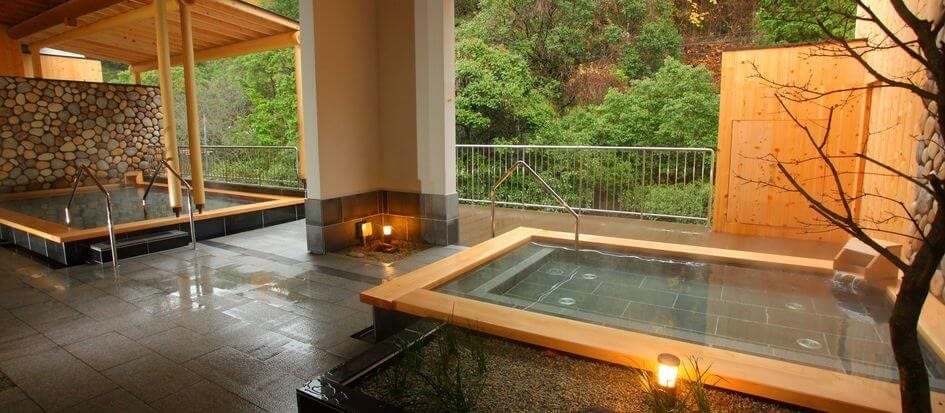 アンチエイジングにも効果的と言われる天然のラドン温泉に浸かれる、日帰り利用も可能な温泉旅館。緑と川のせせらぎを感じられる露天風呂も人気です。