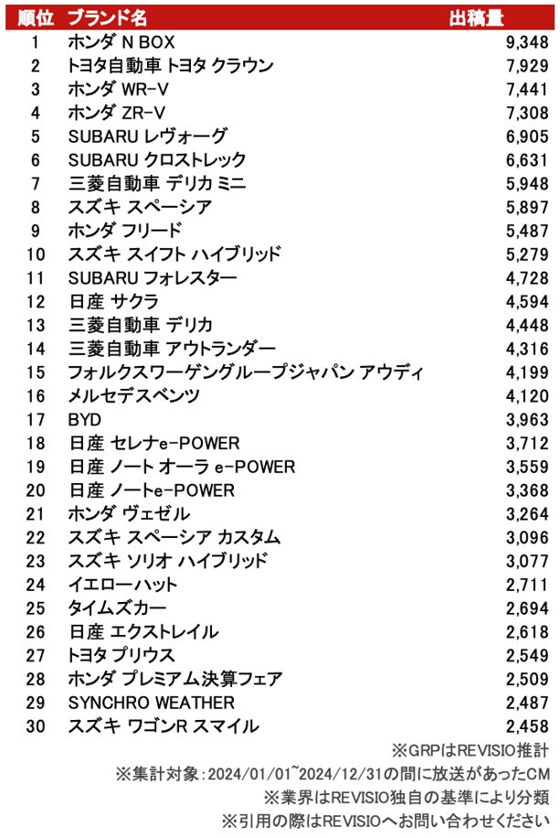 本ランキングにおいて集計対象となった自動車業界の企業・ブランド数は、全部で54社160ブランドでした。(2024/01/01~2024/12/01の間に放送されたCM、業界はREVISIOの基準に準拠)