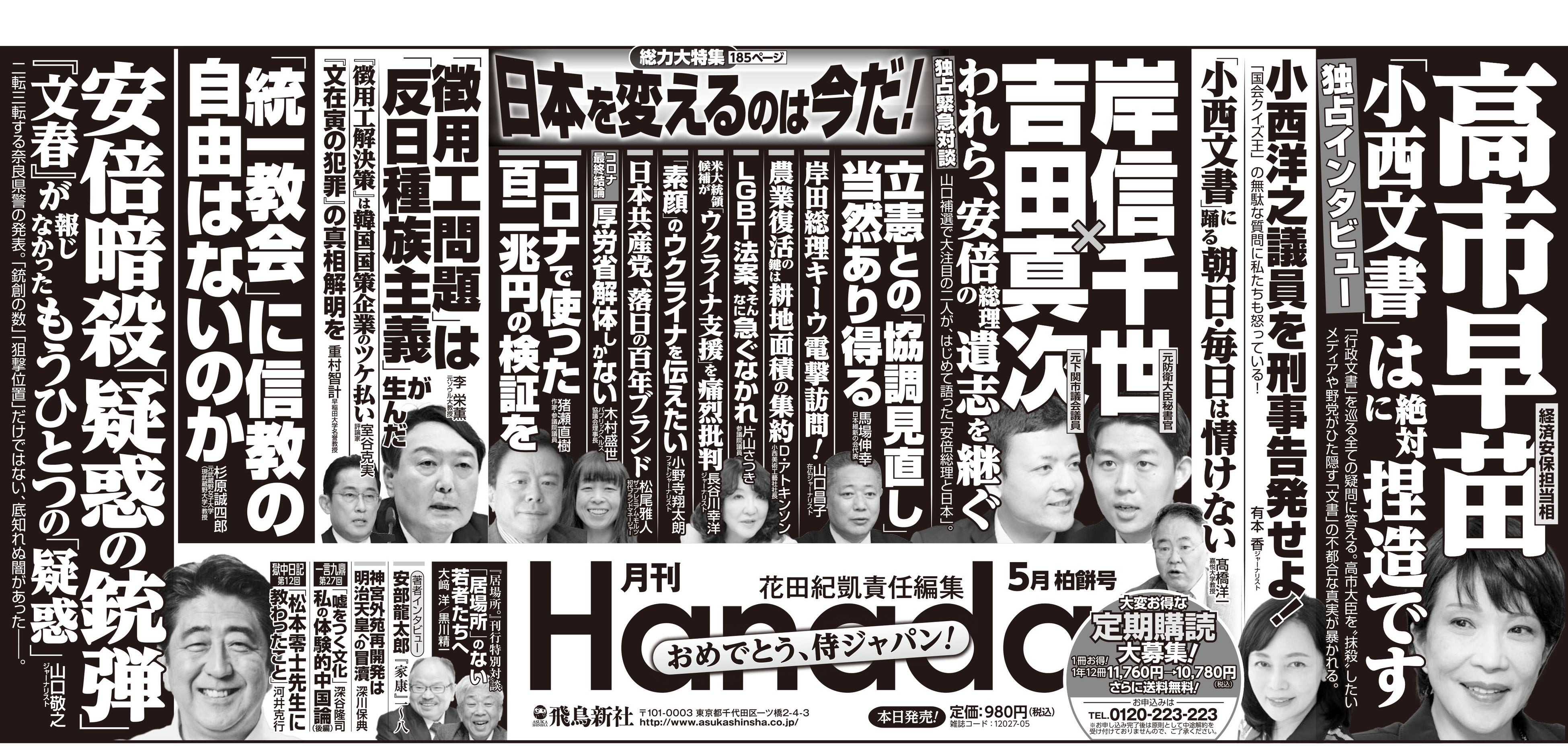 高市早苗経済安全保障担当大臣は3月24日発売の月刊『Hanada』5月号(飛鳥新社刊)の独占インタビューに応じ、「小西文書」について「捏造されたものであると自信を持っています」と改めて強調した。