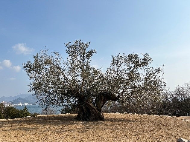 2011年にスペインから約10,000kmの距離、1ヶ月時間をかけ移動し、小豆島の地に移植された樹齢千年のオリーブ大樹、高台にあるこの大樹は今では小豆島の象徴の一つになっており、季節によってはオリーブの実を実らせている光景も見ることができます。