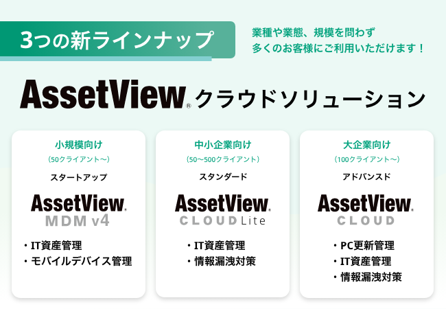 統合型IT運用管理「AssetView(アセットビュー)」は2000年のリリース以来、時代のニーズに応え機能の拡張、強化をしてまいりました。お客様のニーズに応じて、クラウド版・オンプレミス版を用意しており、特にクラウド版においては法人が抱える情報セキュリティ・IT管理課題を包括的に解決する7つの機能(IT資産管理/アプリケーション配布/PC操作ログ管理/デバイス制御/個人情報検索/不正PC遮断/リモートコンソール)をパッケージ化し、ご提供してまいりました。この度、業種や業態、規模を問わずより多くのお客様にご利用いただけるよう、企業の目的・課題に合わせて3つのラインナップから機能をお選びいただける「AssetView クラウドソリューション」の提供を開始します。