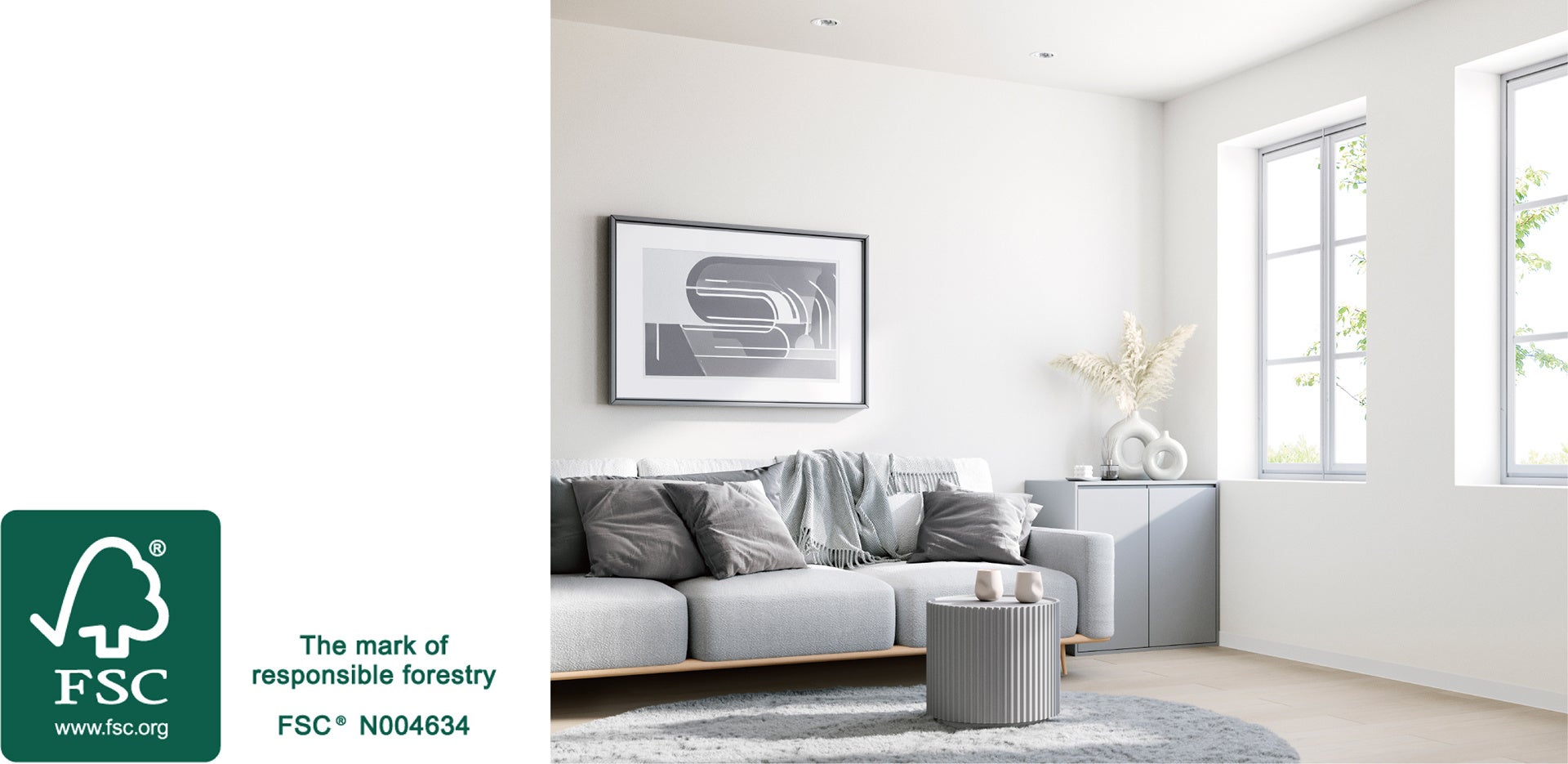 FSC®認証とは、Forest Stewardship Council®が運営する国際的な森林認証制度で、適切な森林管理と、森林から得られた木材や木材製品が、違法伐採などから得られたものではないことを認証するものです。当認証の取得について、塩ビ壁紙では国内初であり、持続的な森林資源から生まれた低環境負荷商品として、壁紙見本帳「2025-2027 SP」に33点収録します。