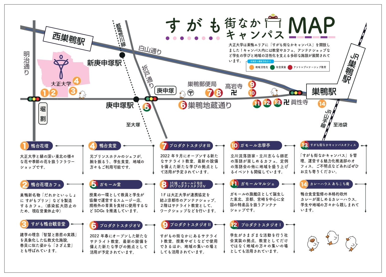 「すがもオールキャンパス構想」を掲げる本学は、巣鴨駅から大正大学までのエリアに「すがも街なかキャンパス」を開設。協働する巣鴨の3商店街沿いに多彩な施設を展開し、学生が地域・企業と連携しながら実践的な学びを深める場となることを目指しています。
