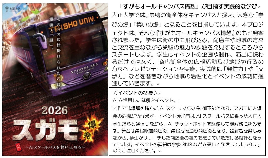 大正大学(学長:髙橋秀裕、所在地:東京都豊島区)はアントレプレナーシップ育成教育プログラムとして産学連携のもと地域の方々と協働で進める「AI謎解きイベントを活用した地域活性化」プロジェクトを始動しました。昨年開催したAR 謎解きイベント「スガモ消滅」に引き続き、AIを活用した謎解きイベント「2026 スガモ爆発」を2022年秋開催(予定)。窪田望招聘教授(株式会社クリエイターズネクスト代表取締役)の指導のもと学生と企業、地域が連携してイベントの成功と巣鴨の商店街の活性化を目指します。