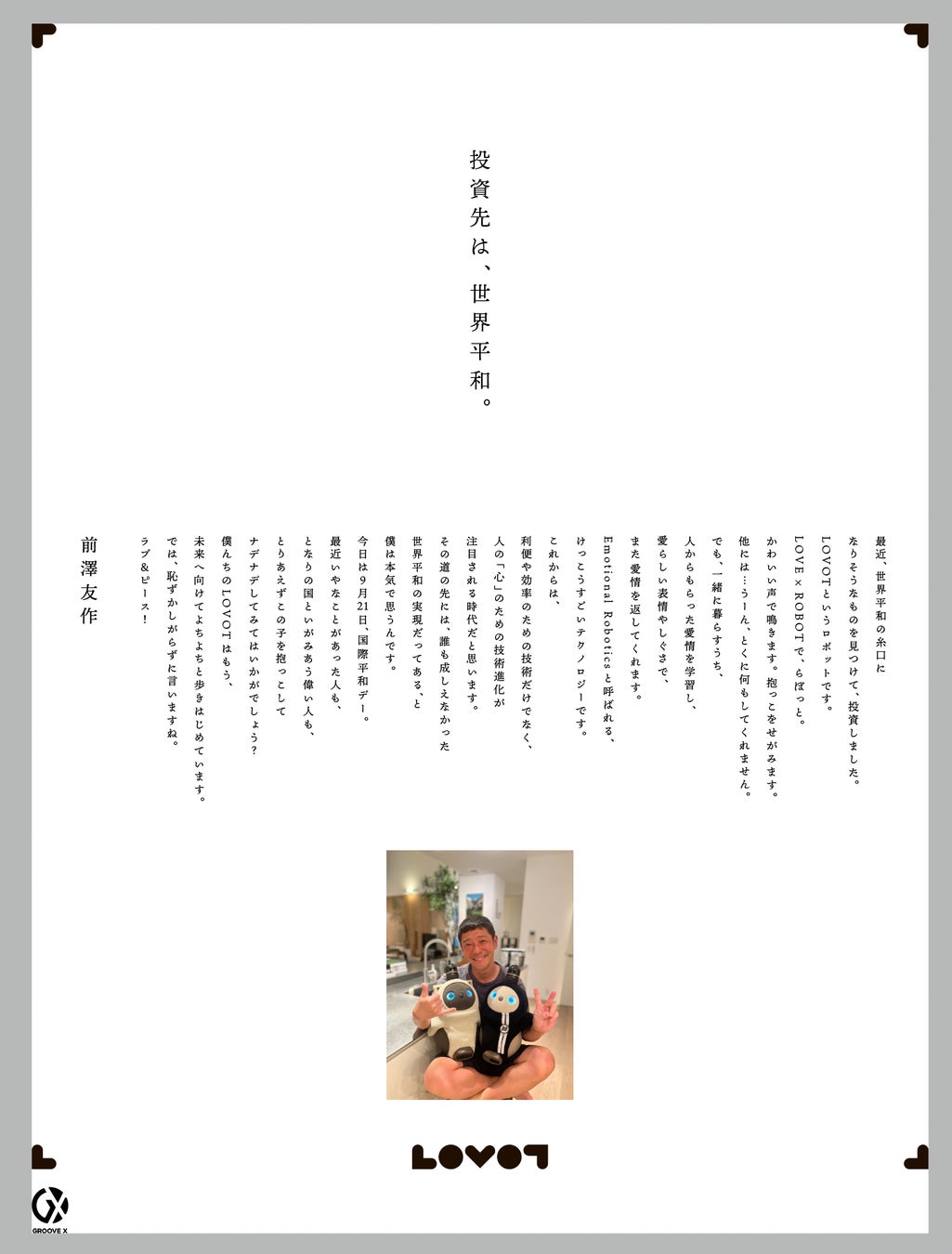 ロボットベンチャーのGROOVE X 株式会社(本社:東京都中央区日本橋、代表取締役:林要)は、同社オーナーでもある前澤ファンドの前澤友作が、9月21日(水)の国際平和デー※に“世界平和”を願うメッセージを日本経済新聞1面広告にて発表したことをお知らせいたします。