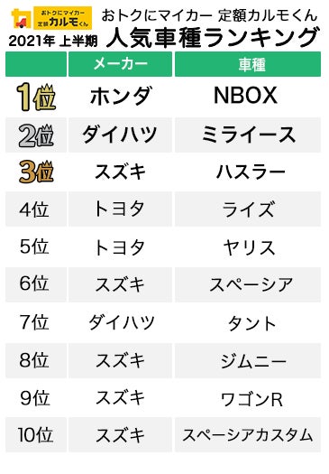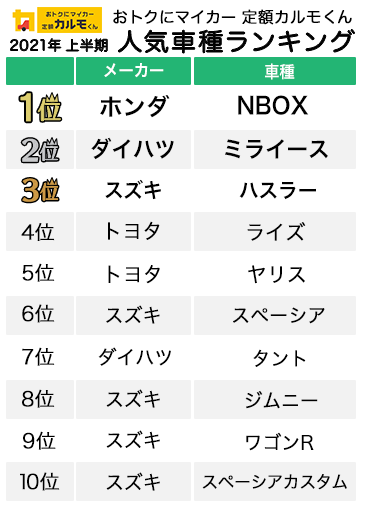 【2022年上半期 新車カーリース 人気車種ランキング】1位N-BOX、2位ミライース、3位ハスラー