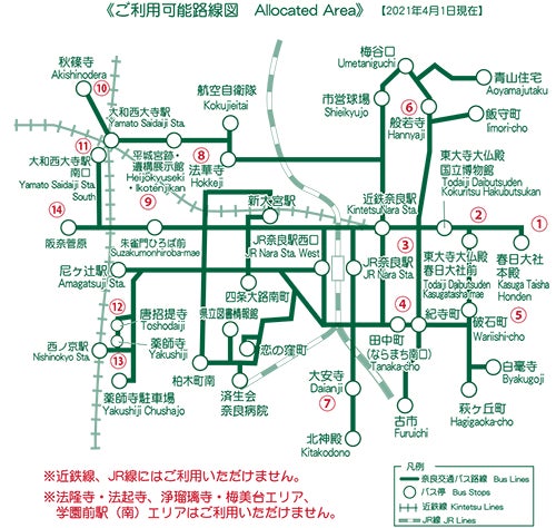 世界遺産「古都奈良の文化財」に登録されている、東大寺・春日大社・興福寺・元興寺・平城宮跡・薬師寺・唐招提寺をはじめとした、奈良公園エリア、西の京エリアの路線バスが1日乗り放題となります。