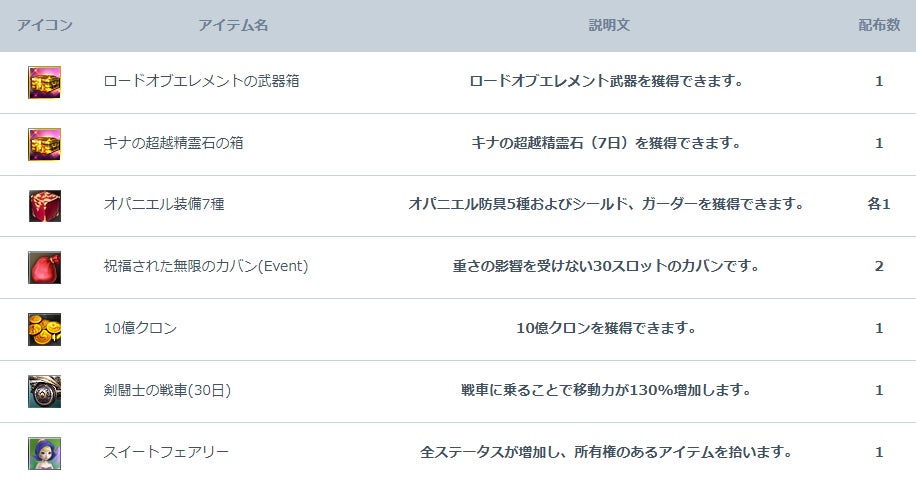 配布アイテムは「オパニエルシリーズ」の防具一式に加え「ロードオブエレメント武器」や2種類の「スキル強化ストーン」といったキャラクター強化に必要なアイテムが使用できます。