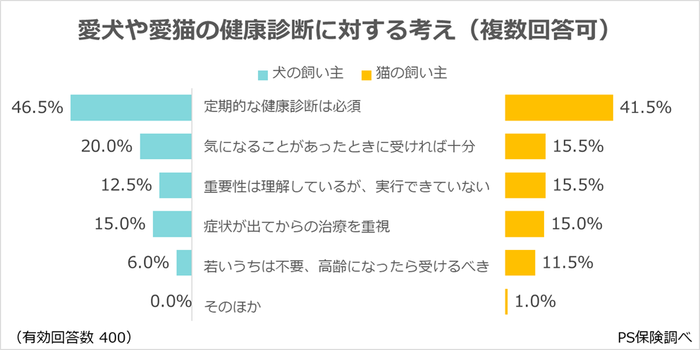 犬は日常的に散歩などで外出する機会が多く、体調の変化に気づきやすいことから、定期的な健康診断を重視する傾向があると考えられます。