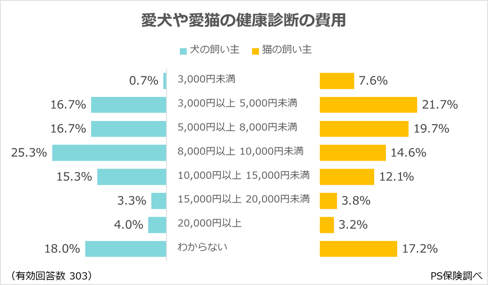 ・猫:「3,000円以上 5,000円未満」(21.7%)が最多。体格や診断項目の違いが影響か、犬よりも低価格帯が中心。