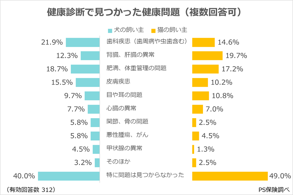 なお、「特に問題は見つからなかった」が40.0%であることから、実に6割の犬に何らかの異常が見つかっているという事実も見逃せません。