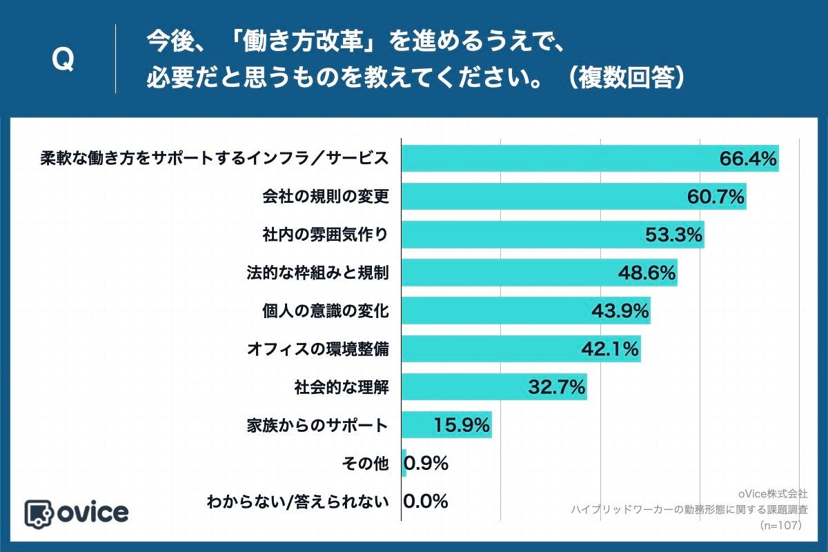 「Q.今後、「働き方改革」を進めるうえで、必要だと思うものを教えてください。(複数回答)」(n=107)と質問したところ、「柔軟な働き方をサポートするインフラ/サービス」が66.4%、「会社の規則の変更」が60.7%、「社内の雰囲気作り」が53.3%という回答となり、上位5項目のうち4項目は制度や雰囲気など、ソフト面に関するものでした。