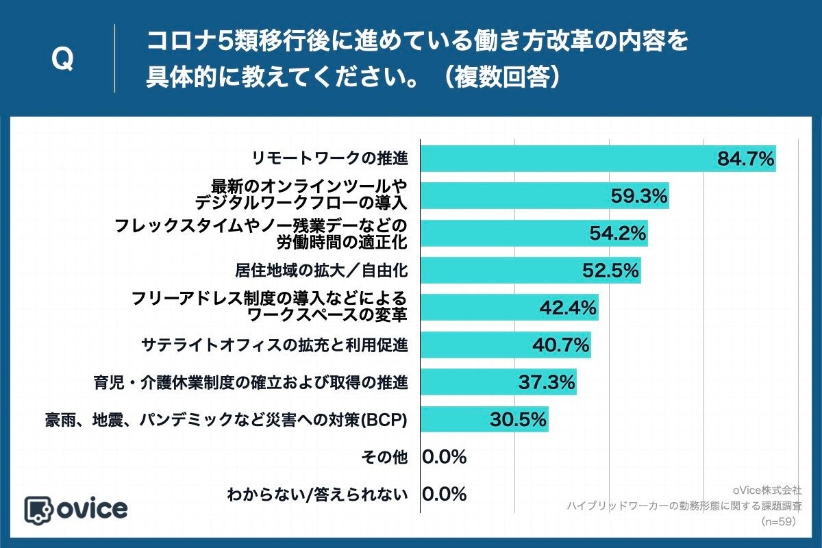 「さらに加速させた」と回答した方に、「Q.コロナ5類移行後に進めている働き方改革の内容を具体的に教えてください。(複数回答)」(n=59)と質問したところ、「リモートワークの推進」が84.7%、「最新のオンラインツールやデジタルワークフローの導入」が59.3%、「フレックスタイムやノー残業デーなどの労働時間の適正化」が54.2%という回答となりました。