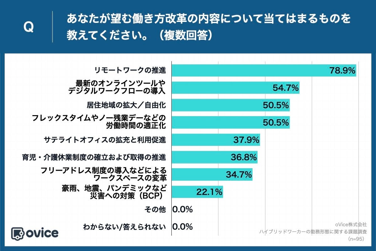 「とても望んでいる」「やや望んでいる」と回答した方に、「Q.あなたが望む働き方改革の内容について当てはまるものを教えてください。(複数回答)」(n=95)と質問したところ、「リモートワークの推進」が78.9%、「最新のオンラインツールやデジタルワークフローの導入」が54.7%、「居住地域の拡大/自由化」が50.5%という回答となりました。