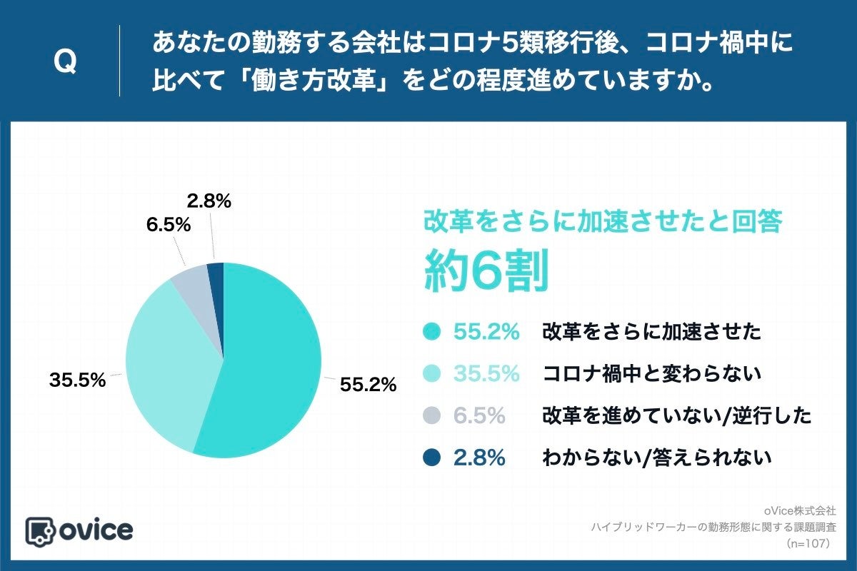 「Q.あなたの勤務する会社はコロナ5類移行後、コロナ禍中に比べて「働き方改革」をどの程度進めていますか。」(n=107)と質問したところ、「改革をさらに加速させた」が55.2%、「コロナ禍中と変わらない」が35.5%という回答となりました。