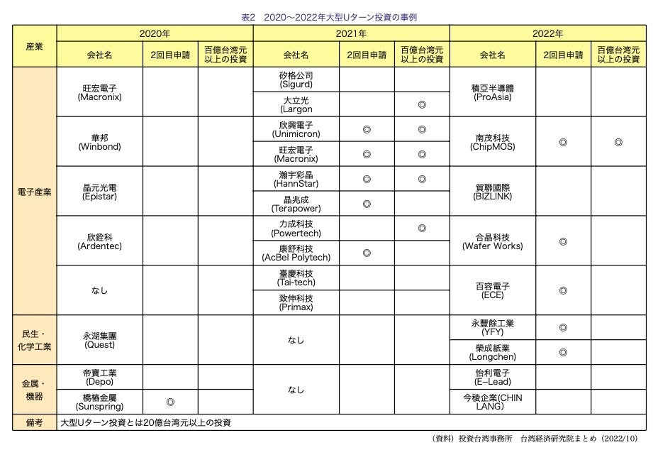 Uターン投資促進プランへの申請は、同プランが実施された19年に最も多く、次に多かったのは21年だ。米中対立を受け、電子関連メーカーを中心に二度目の申請を行う台商も増えてきており、投資額も一度目より多い。