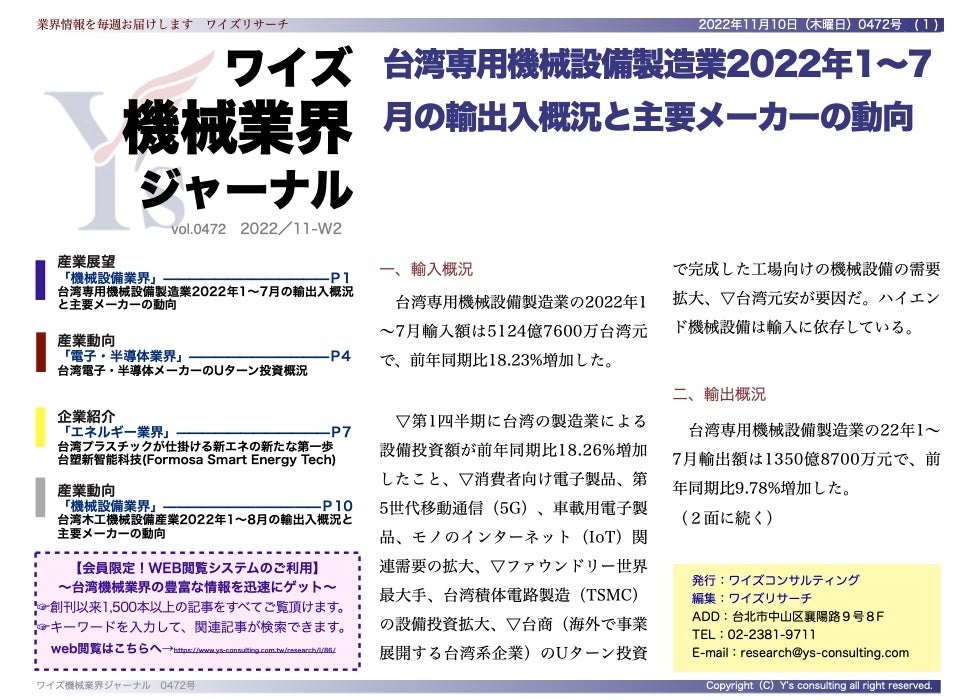 ワイズコンサルティング グループ(本社:中華民国台北市、代表取締役:吉本康志)は台湾機械業界専門誌「ワイズ機械業界ジャーナル」の2022年11月第2週号を発行しました。今週号では、械設備業界、電子・半導体業界、エネルギー業界の代表企業と木工機械設備業界の動向を紹介します。