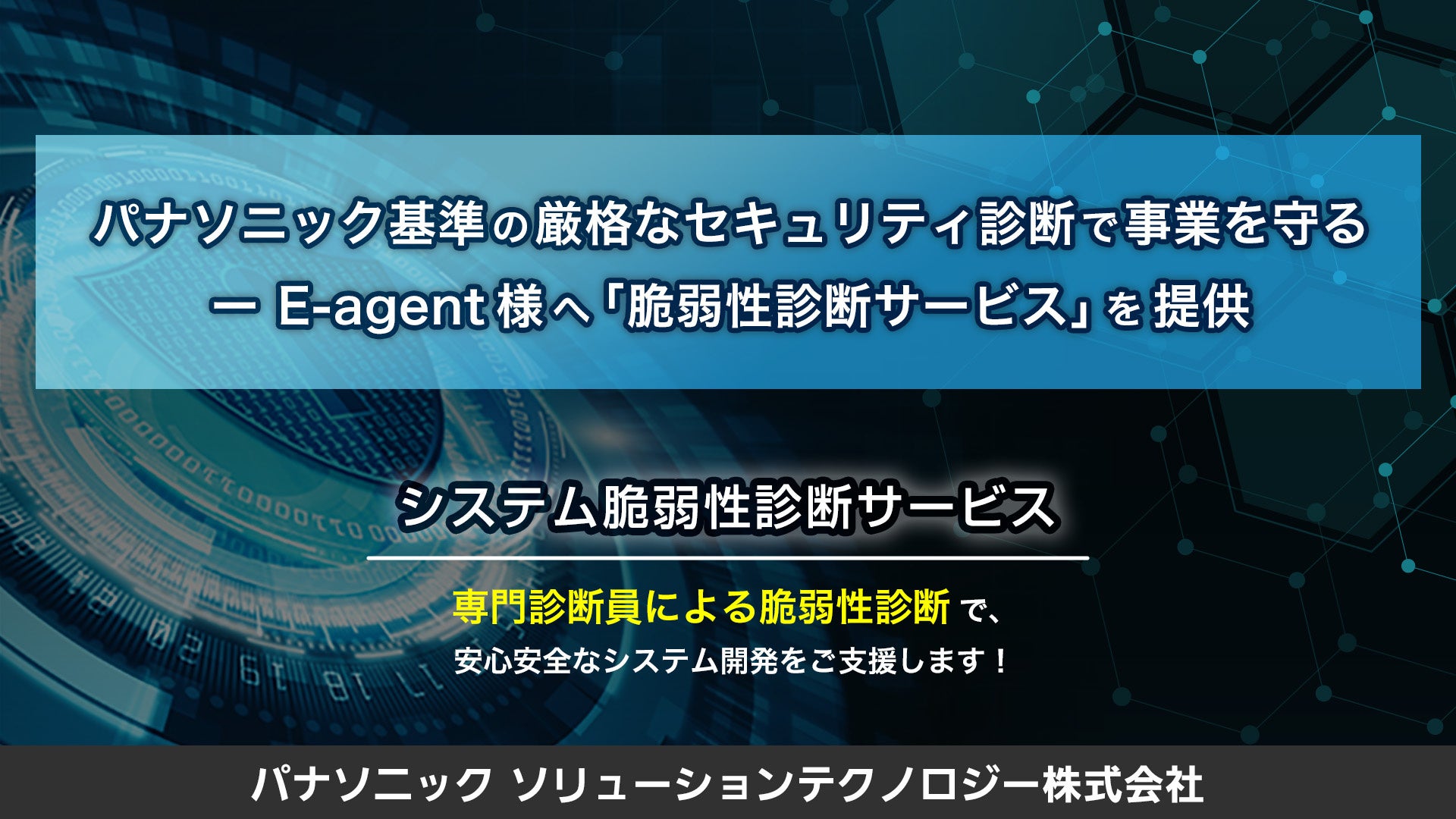 パナソニック ソリューションテクノロジー株式会社(本社:東京都、代表取締役社長:伊藤 一義/以下、パナソニック)は、E-agent株式会社(本社:東京都、取締役社長/CEO:大橋 宏一郎/以下、E-agent)様に「システム脆弱性診断サービス」を提供しました。