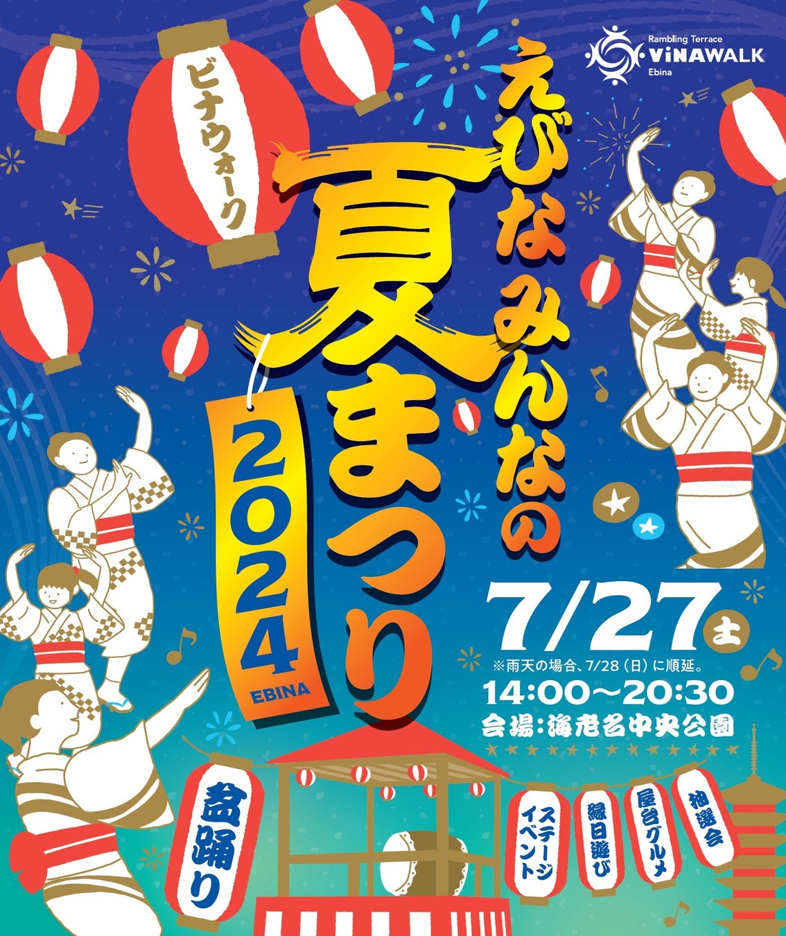 株式会社小田急SCディベロップメント(本社:東京都新宿区 取締役社長:細谷 和一郎)が運営する海老名駅直結商業施設「ビナウォーク」と、「海老名市文化芸術協会」、海老名中央公園指定管理者「小田急・相鉄グループ」は、2024年7月27日(土)に海老名中央公園にて「えびな みんなの夏まつり 2024」(以下、「本イベント」)を開催します。(雨天時は7月28日(日)に延期)