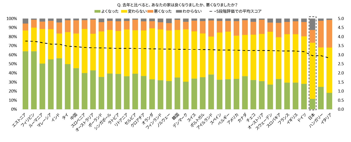 - 「昨年と比べて自分の家についてよりポジティブに感じている」と回答した日本人は12%のみで、調査対象37ヵ国中35位と低い結果に