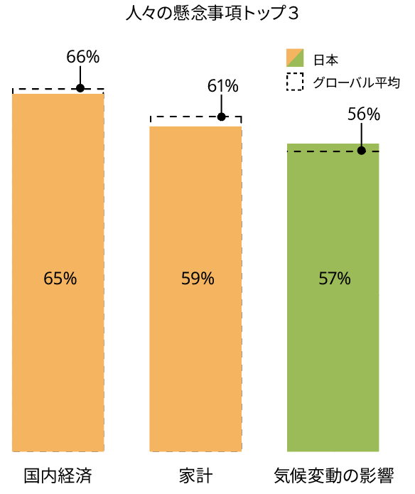 - 世界は気候変動の影響よりも、国内の経済と家計の危機を懸念