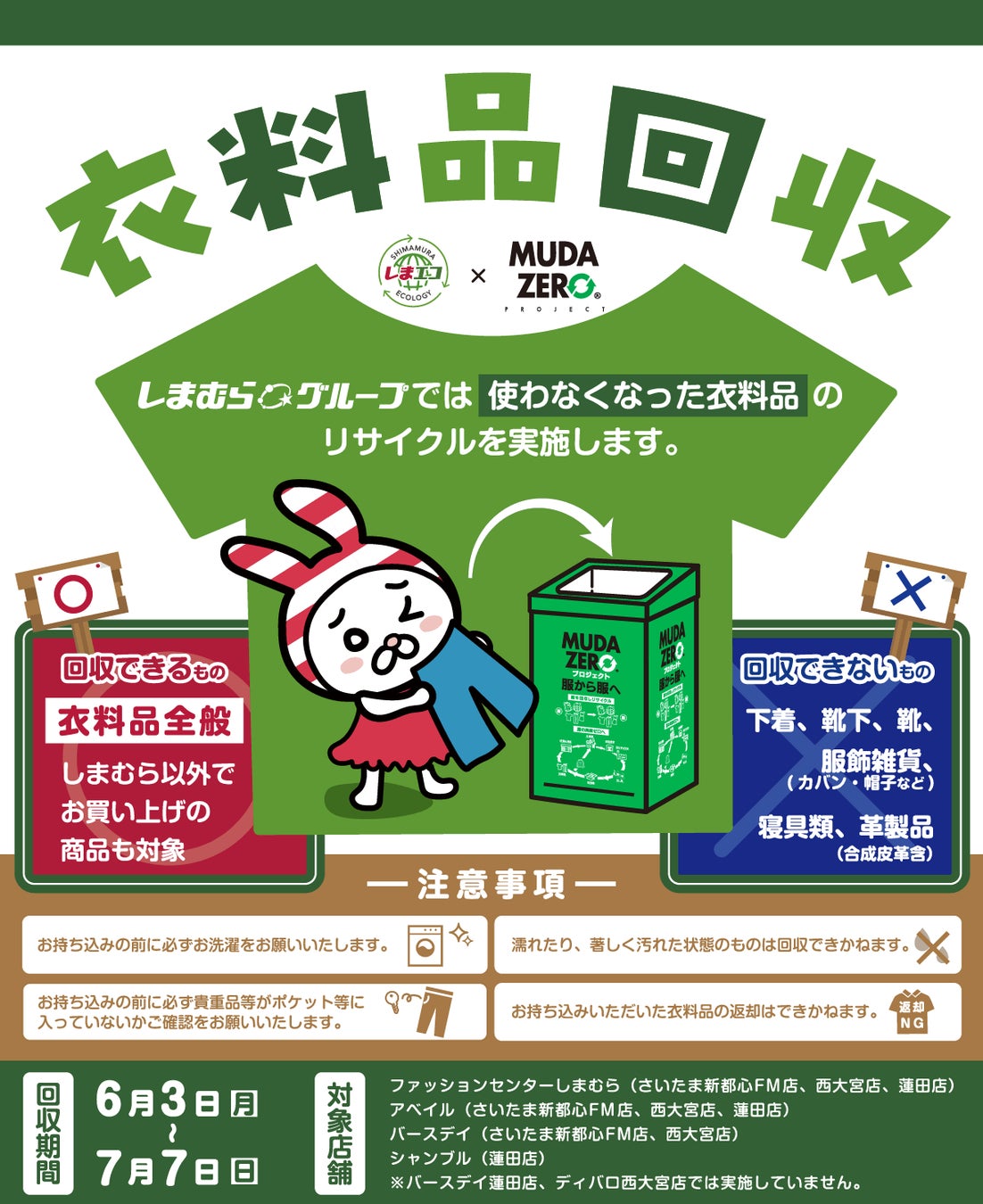 株式会社しまむら(本社所在地:埼玉県さいたま市大宮区北袋町1-602-1、代表取締役:鈴木 誠)は、6月3日(月)から7月7日(日)まで、一部店舗で衣料品回収を実施します。