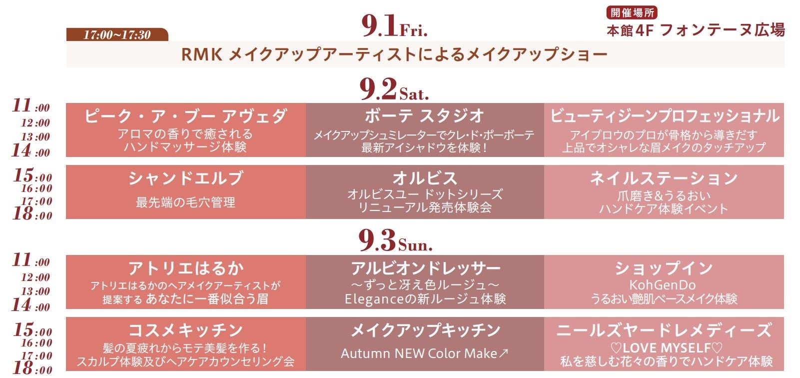 「お気に入りのアイテムに出会ったら、今年の秋はもっと好きな自分になれるはず」をコンセプトに、誰もがトキメキを感じるような商品のタッチアップや、サービスを無料で体験できます。また、9月1日(金)にはRMKのメイクアップアーティストによるメイクショーも開催。