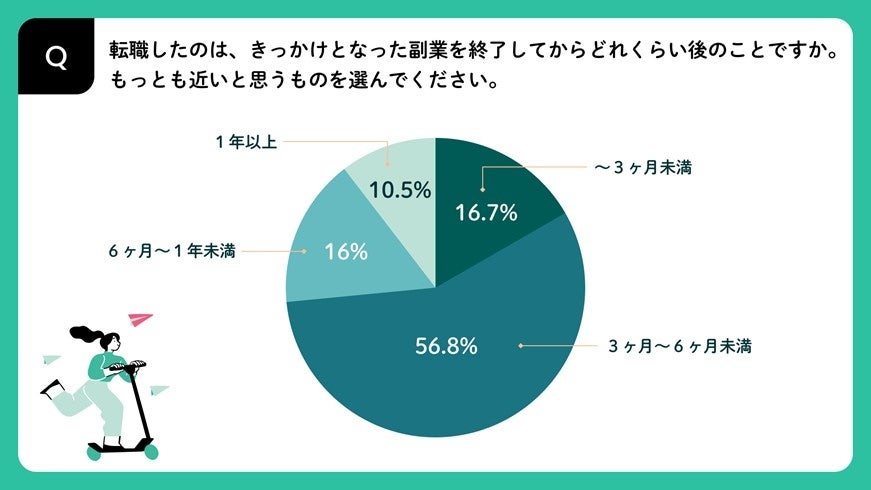 「転職したのは、きっかけとなった副業を終了してからどれくらい後のことですか。」と尋ねたところ、3か月未満は16.7%、3か月~6か月未満は56.8%、6か月~1年未満は16%、1年以上は10.5%となりました。3か月~6か月未満が最も多いことから副業が終了してすぐではなく、数か月、今の会社との比較や自身のキャリアについて考えてから転職を決める方が多いことが伺えます。