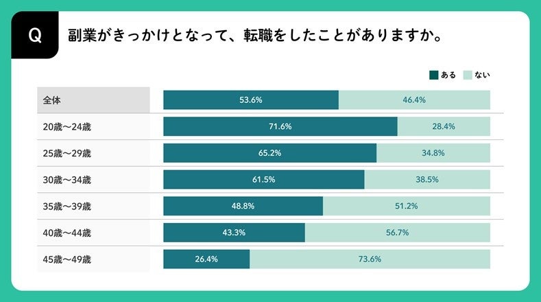 ✓副業がきっかけとなって転職したことがあるのは20代が最多に