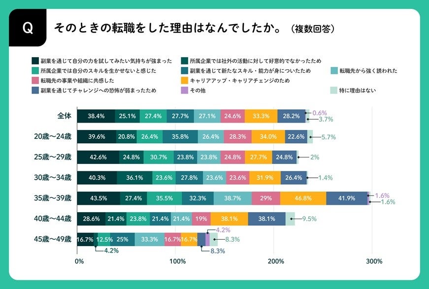 年齢別で転職理由を見てみると、20歳~24歳、25歳~29歳、30歳~34歳においては「副業を通じて自分の力を試したい気持ちが強まった」が最も多い理由となりました。35歳~39歳では「キャリアアップ・キャリアチェンジのため」で46.8%となりました。40歳~44歳では「キャリアアップ・キャリアチェンジのため」、「副業を通じてチャレンジへの恐怖が弱まったため」がならび38.1%でした。45歳~49歳は「転職先から強く誘われた」が最も多く33.3%となりました。