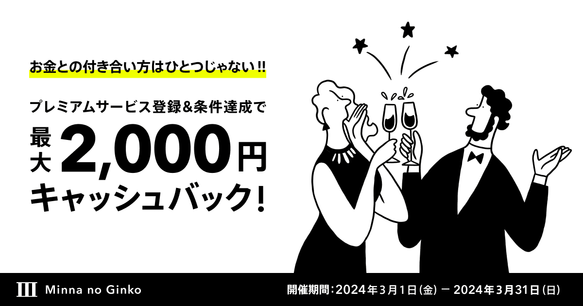 この機会に「お金」との付き合い方を考え、より便利でお得にお客さまのスタイルに合わせた使い方をお選びいただけるように、2024年3月1日~2024年3月31日の間にプレミアムサービスに加入した方を対象に、条件達成に応じて現金最大2,000円をキャッシュバックする「みんなの銀行の日プレミアムキャンペーン」を実施します。