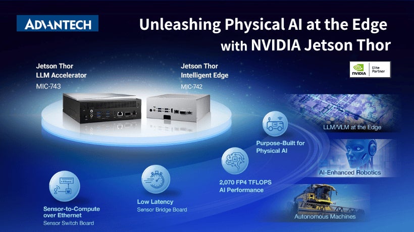 2025年5月19日 - Advantech Co., Ltd (台湾、TWSE: 2395、以下 アドバンテック)は、COMPUTEX 2025のブースK0605にて、NVIDIA Jetson Thorとのフルスタック統合をライブでご紹介します。高性能エッジAIプラットフォーム「MIC-743」を搭載し、インテリジェントモビリティ、エッジでのビジョン言語モデル(VLM)、ヒューマノイドロボティクスに最適化された、コンパクトかつ堅牢なソリューションを提供します。