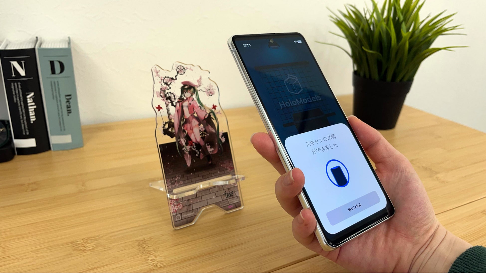 NFCタグを搭載した専用のNFCアクスタに「HoloModels」アプリを起動させた状態のスマホをかざすと、そのデザインに合わせた背景とデジタルフィギュアが瞬時に表示されます。