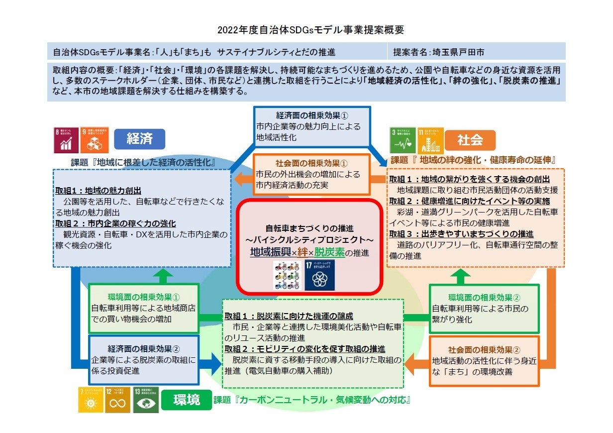 この度、埼玉県戸田市が提案するSDGs(持続可能な開発目標)の達成に向けた取組計画「一人ひとりの行動変容から始まる持続可能なまちづくり ~『このまちで良かった』 みんな輝く 未来共創のまち とだ~」が、優れた取組として認められ、令和4年5月20日(金)に国(内閣府)から「SDGs未来都市」に選定されることとなりました。今後は、SDGs未来都市として、2030年のゴールの達成に向けた取組を一層進めてまいります。