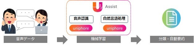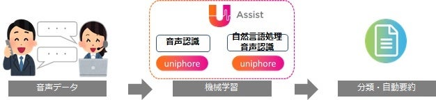 U-Assist は、通話内容全体をベースに分類・要約するのではなく、通話内容を分類するキーワードと、通話データの活用方法に応じた要約項目をあらかじめ設定し、ディープラーニング(深層学習)、機械学習を活用した言語理解モデルを用いることでリアルタイムの自動分類精度を高めることが可能です。従来のシステムでは、音声データのテキスト化、分類、要約の各プロセスが別システムとなっていましたが、U-Assistは音声データを投入するだけですべての処理を一元的に行うことが可能であり、維持・運用がしやすいこと、CRMや業務アプリケーションとリアルタイムに連携し、コミュニケーターの入力作業を自動化、簡素化することを可能である点が特長となります。