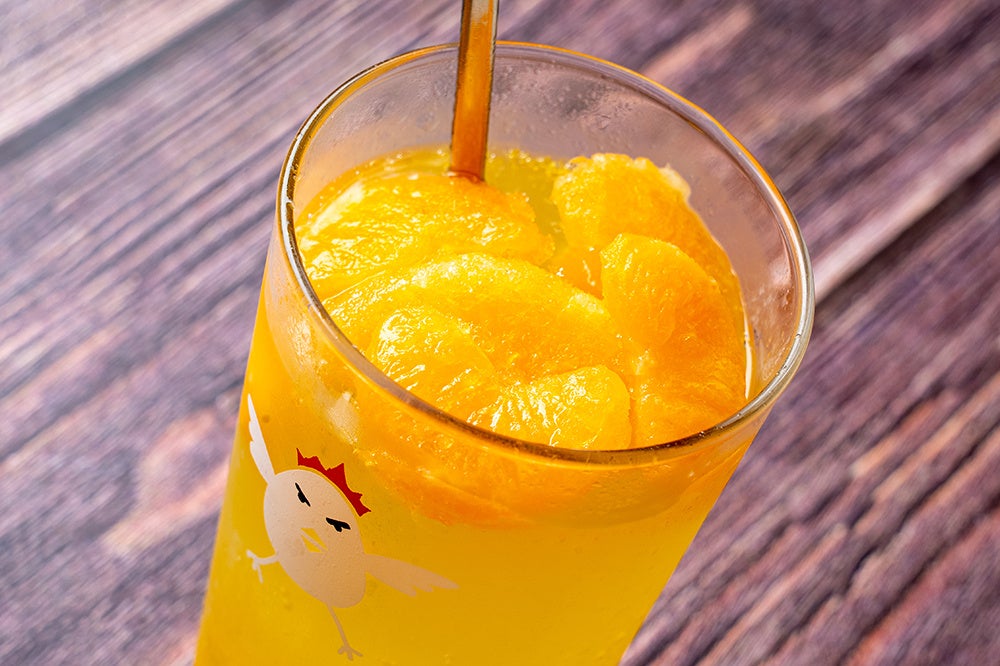 “凍らせたみかん”をグラスに浮かべたドリンク。みかんの甘みとほのかな酸味が、冬の串・鍋料理と好相性です。