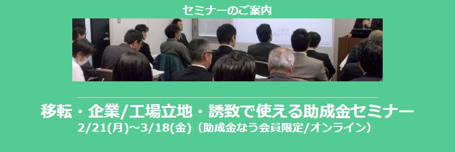 「移転・企業/工場立地・誘致で使える助成金セミナー」を、2月21日(月)~3月18日(金)まで期間限定でお届けいたします。
