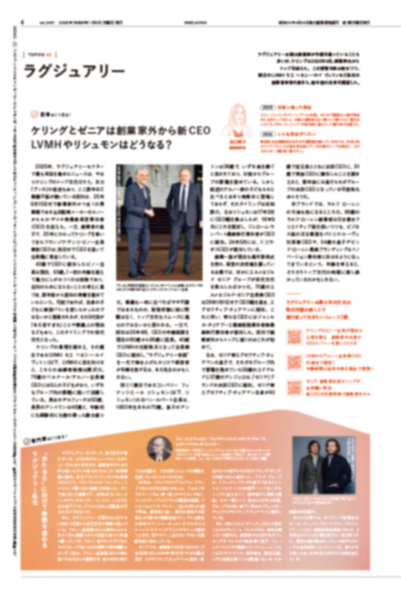 「デザイナー人事」「ラグジュアリー」「M&A」「百貨店」「素材&商社」「サステナビリティ」「大手アパレル」「ウィメンズ」「メンズ」「ジュエリー」「海外ビューティ」「国内ビューティ」「ビューティ小売り」それに「ヘアサロン」というそれぞれのトピックについて、「WWDJAPAN」の記者が忖度なしに今年を大胆予測したほか、各ページでは専門家にも意見を仰ぎ、同じトピックを違う角度からも分析しています。それぞれのカテゴリーでは今何が起こっていて、私たちは今年1年のニュースとどう向き合えばいいのか?そんな14の道標にぜひ注目してください。