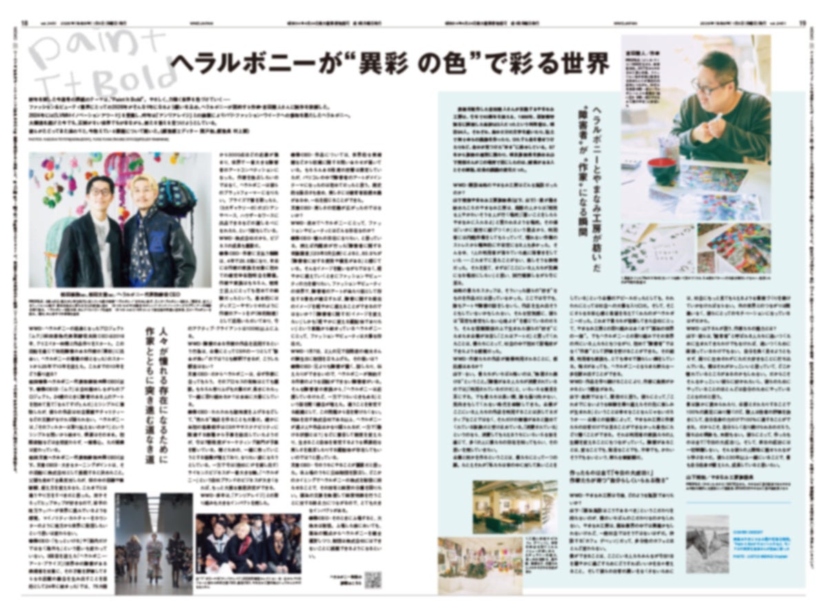 新年最初の「WWDJAPAN」の表紙は、昨年で活動スタートから10年を迎え、「アンリアレイジ(ANREALAGE)」とのパリでのファッションショーでも大活躍したヘラルボニーとタッグを組み、同社の契約作家の吉田陸人さんに作っていただきました。ファッション&ビューティ業界の景色が“上描き”されることを願い、モノクロの馬の写真の上に、大胆かつカラフルな色彩を加えてもらっています。紙面では、ヘラルボニーの松田崇弥&文登・共同CEOにこれまでの10年を振り返ってもらいつつ、陸人さんが籍を置く障害者施設「やまなみ工房」の山下完和・施設長に作家として活動するようになってからの陸人さんの様子を伺いました。