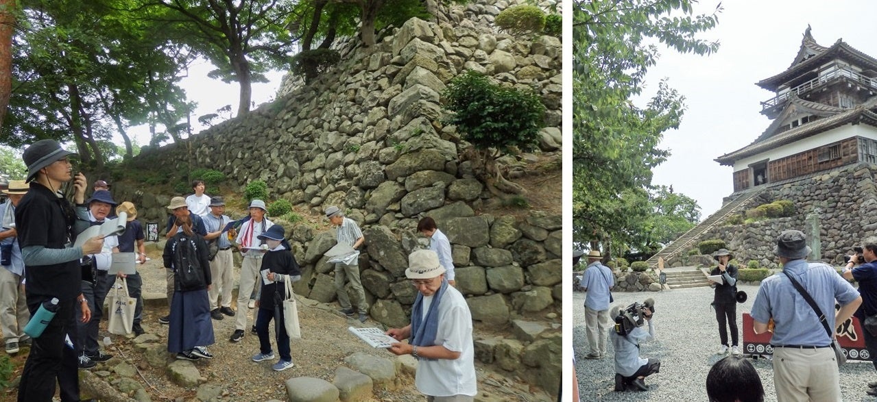 現存十二天守のひとつ、重要文化財の「丸岡城」天守の国宝化を目指す福井県坂井市の教育委員会は7月8日に、城山整備基本計画策定に向け、課題の把握や現状を確認する現場視察(エクスカーション)を行った。お天守が鎮座する城山は、明治、大正時代の城の荒廃のあと、昭和初期には次第に公園化が進み、桜などが植えられ大きく景色が変わり、石垣も法面も何度か崩落に遭っている箇所があるなど築造当時の江戸時代の面影とは大きく姿を変えている。どこまで往時の城山に戻すのかなどの基本方針が計画案に盛り込まれる予定で、この日参加した市民20人や専門家らは、城を見上げながら「国宝化に向け、城としての丸岡城をどう見せていくのか、より良い姿を考えていきたい」と今後の整備に期待を込めていた。市教委は、城山整備基本計画は2026年度末の策定を目指し、翌27年度から具体的な事業に着手していく。